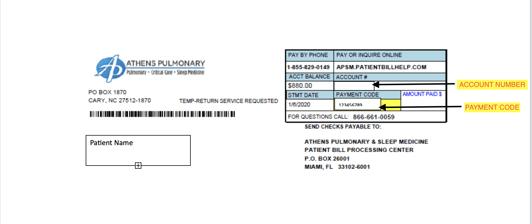 Please see the example statement indicating where this unique payment code can be found on your statement.