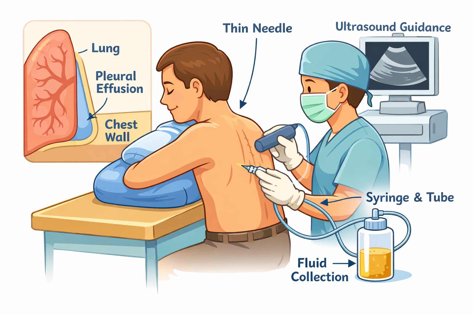 Thoracentesis is generally safe, but possible risks include bleeding, infection, or lung collapse (pneumothorax). Serious complications are uncommon when the procedure is performed carefully.
